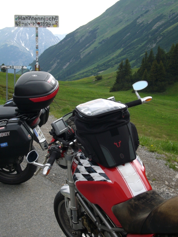 Nach dem verlängerten Wochenende liefern wir kurz die Zeltausrüstung zu Hause ab, und machen uns gleich wieder auf den Weg nach Vorarlberg in den Schönauer Hof. Bei herrlichem Wetter starten wir zu einer Tour über das Hahntennjoch, zum Reschen-Pass, Stilfserjoch, Umbrail- und Ofen-Pass. Dummerweise sondert meine gute Duc kurz vor der Passhöhe am Hahntennjoch plötzlich Gestank und Rauchzeichen ab! Also schnell gestoppt und nachgesehen - irgendwo am Motorgehäuse tritt Öl aus und tropft auf den heißen Auspuff. Nachdem alle ersichtlichen Schrauben nach gezogen sind, geht's vorsichtig zurück ins Tal, um an einer Tankstelle mit Waschplatz erst mal den Motor zu reinigen und eventuell besser erkennen zu können, wo das Öl her kommt.
