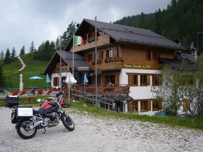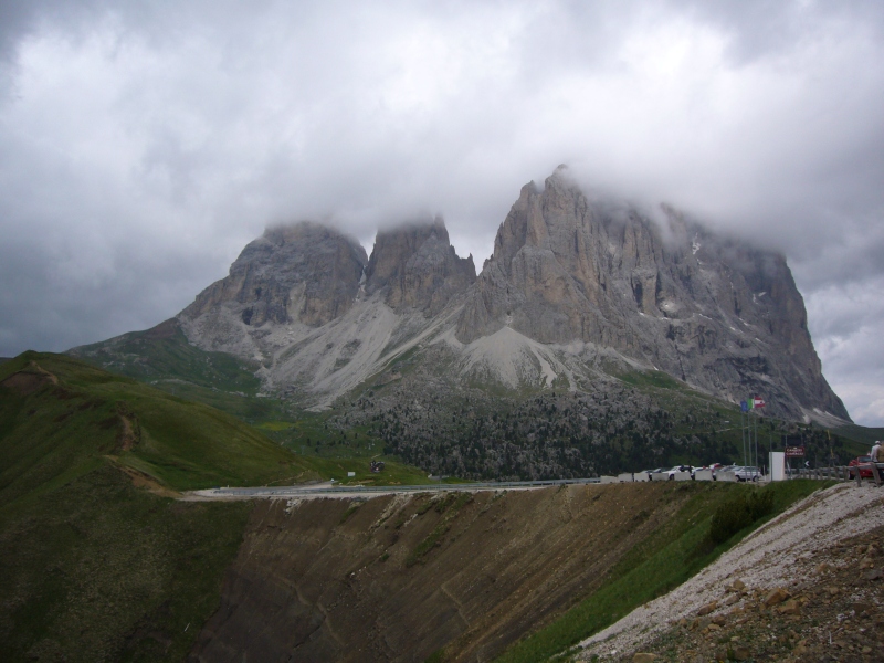 Bei unbeständigem Wetter starten wir zu einer Runde über Sella- und Grödner-Joch, wo wir gerade rechtzeitig eintreffen, um ein aufziehendes Gewitter bei einem Cappuccino auszusitzen.