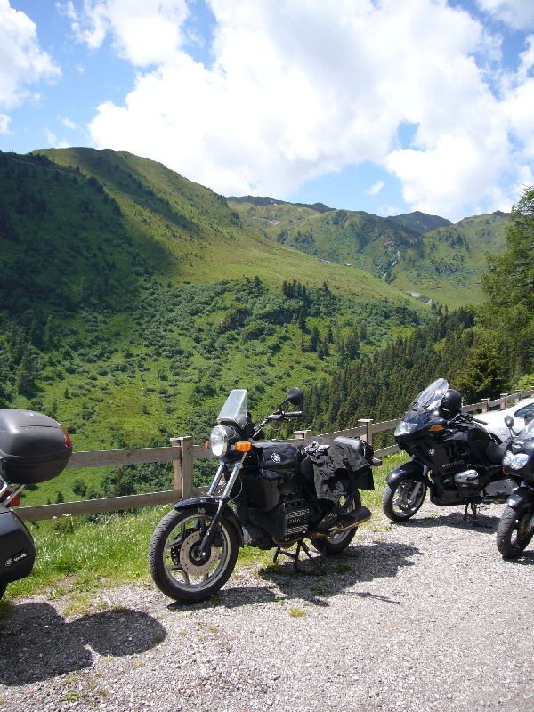Auslaufmodell von BMWAuf der Zillertaler Höhenstraße erweist sich dann eine alt gediente BMW als Auslaufmodell - das Schauglas am Kühlflüssigkeits-Behälter war zu marode für die schlechte Straße und hat sich mit einem Teil des Kühlwassers aus dem Staub gemacht. Mit regelmäßigen Frischwasser-Infusionen kommt sie aber noch gut nach Brannenburg und darf den Heimweg dann auf dem Anhänger zurücklegen.