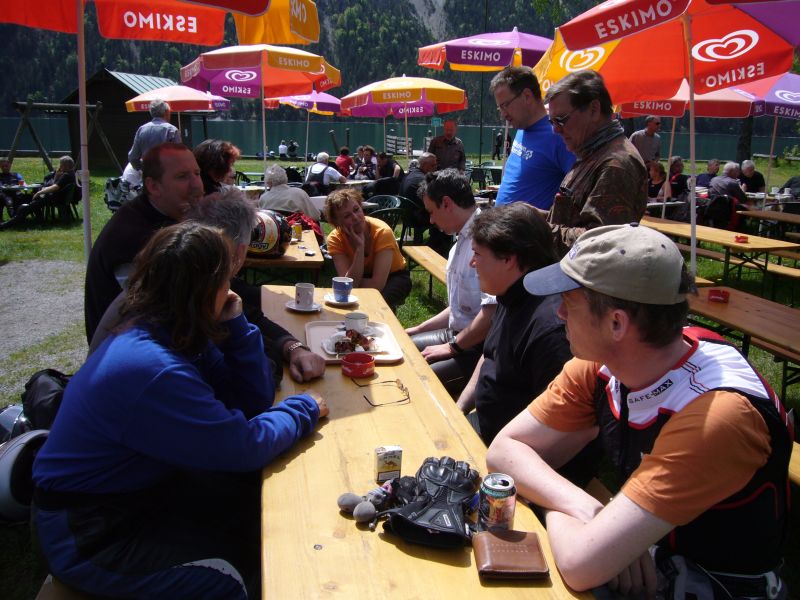 Frühstückspauseam PlanseeFür eine Tour ins Namlostal führt uns der Weg zunächst über Miesbach, Bad Tölz und Kochel nach Eschenlohe, wo wir noch einige weitere Biker aus München treffen. Zusammen geht's über Ettal zum Plansee, wo wir erst mal eine Frühstückspause einlegen. Weiter über Berwang ins Namlostal und nördlich zum Mittagessen bei Zöblen.