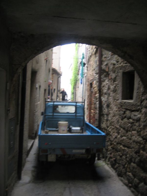 No bagare per un Moto Italiano!In Roccatederighi nieselt es dann ein wenig, und ein plötzlich aus einer Seitengasse rutschender Geländewagen bringt mich zu einer verhängnisvollen Vollbremsung die mich zu Boden gehen lässt - wie sich heraus stellt haften schmutzig-feuchte Zebrastreifen etwa so gut wie Schmierseife! Zum Glück passierte es genau vor einer Werkstatt und der freundliche Mechaniker hiflt sofort, die verbogenen Teile wieder gerade zu biegen und die leckende Kupplung zu dichten. Und weil's ein Italienisches Motorrad ist, nimmt er auch kein Dankeschön an!