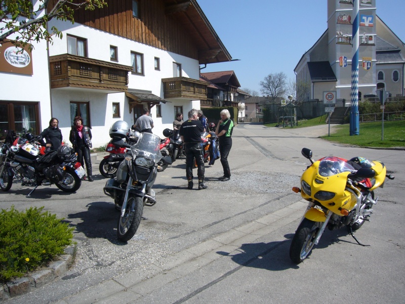 Für Sonntag ist dann eine Tour mit den Netbikern geplant. Wir sind dann zu zwölft am Treffpunkt in Pfaffenhofen. Die (von Ausflüglern verstopften) Hauptstraßen meidend, geht's über Emmering, Pfaffing und Haag nach Gars. Über Schnaitsee und Seeon auf flotten Kurven an den Chiemsee, wo wir beim Kupferschmied auf einen Cappucino in der Sonne genießen. Gestärkt geht's weiter über Pittenhart und Bad Endorf auf den Samberberg. Dort kehren wir nochmal ein, bevor wir uns trennen. Über Brannenburg und Bad Feilnbach bringe ich die letzten Heimkehrer auf den Weg, bis ich mich bei Beyharting dann verabschiede.